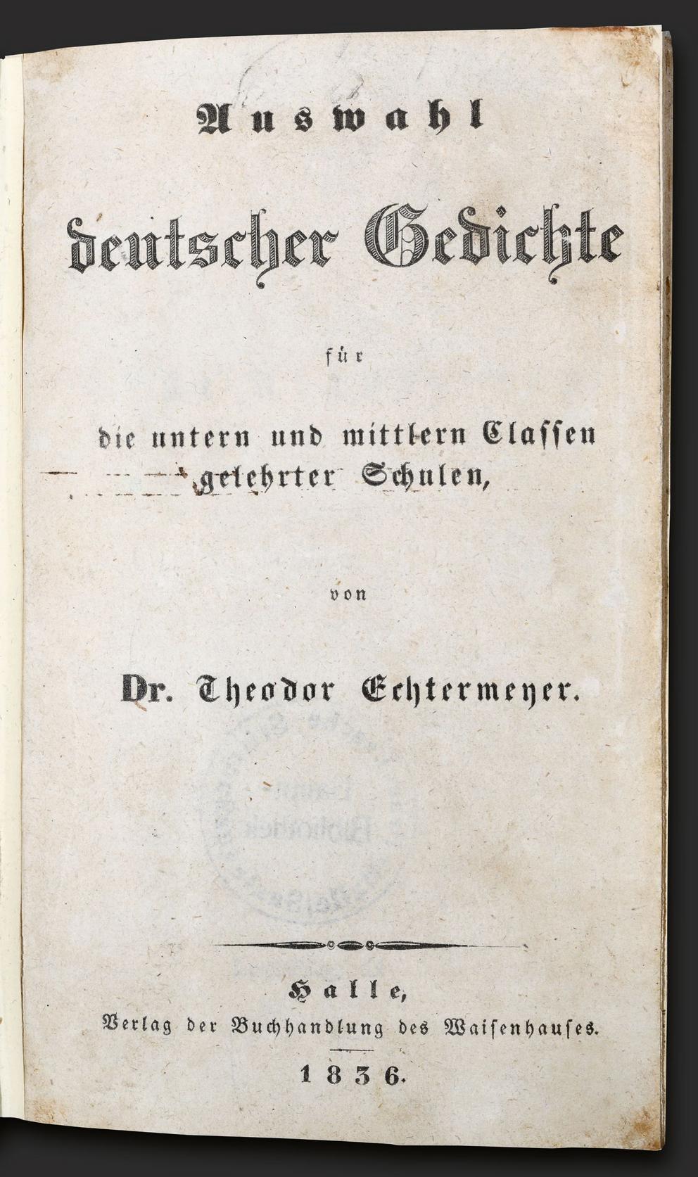 Theodor Echtermeyer (Hrsg.): Auswahl deutscher Gedichte für die unteren und mittleren Classen gelehrter Schulen. Halle 1836. BFSt: S/VERL:2304